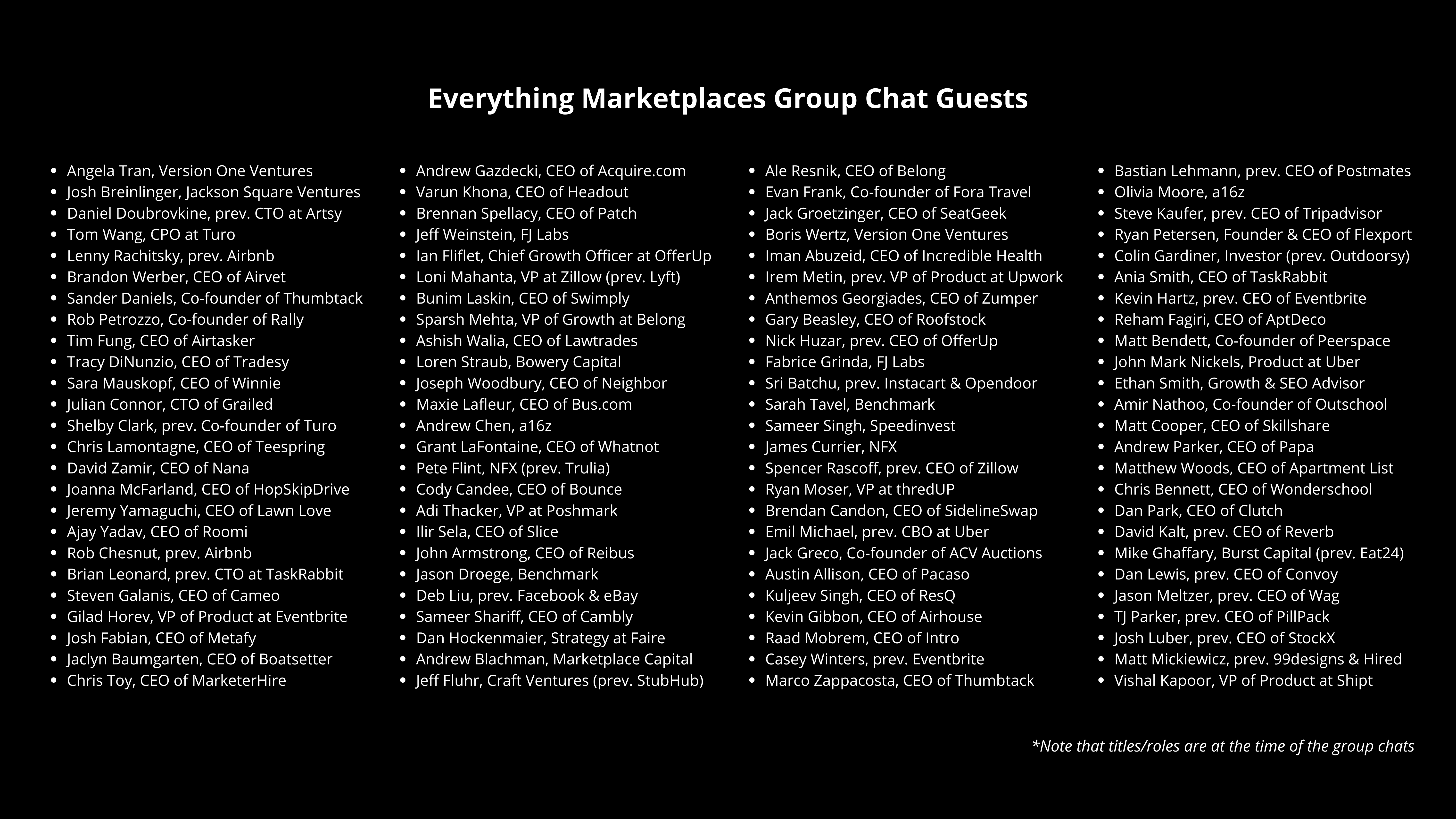 We’ve had some of the most notable marketplace founders & leaders like Marco Zappacosta from Thumbtack, Andrew Chen from a16z, Ryan Petersen from Flexport, Bastian Lehmann from Postmates, Josh Luber from StockX, Grant LaFontaine from Whatnot, James Currier from NFX, Spencer Rascoff from Zillow, Steve Kaufer from Tripadvisor, and more join us as guests.