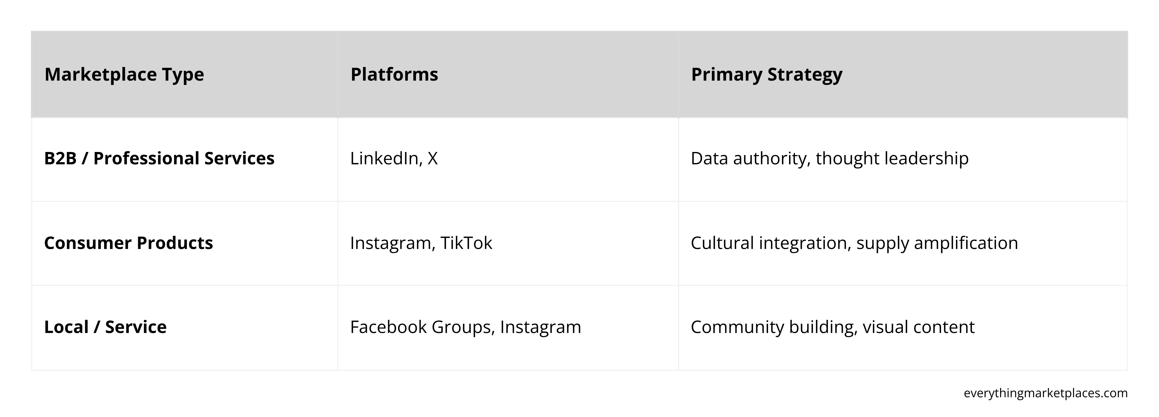 Low-frequency marketplaces should start with 1 platform and focus on evergreen content. Quality over volume since users don’t return as often.